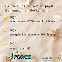 Hey du! Wusstest du, dass jeder Mensch einen Piraten in sich trägt? Einen Piraten, der uns sagt, wie wir sein sollen, wie wir uns am besten verhalten sollen? Einen Piraten, der uns lenkt und machmal sogar unser Steuer übernimmt. Geh mit uns auf Piratenjagd, nicht irgendwo da draußen, sondern in dir selbst. Gemeinsam entdecken wir: TAG 1: Was denke ich? Was treibt mich an? TAG 2: Welche Gefühle habe ich? Wie gehe ich damit um? TAG 3: Was tut mir gut? Wie grenze ich mich ab? Du brauchst keine Vorkenntnisse, sondern Neugier, Mut, Offenheit und Lust dich auf dich selbst einzulassen. Mit Spielen, kreativen Übungen, kleinen Challenges und ruhigen Momenten findest du deinen Piraten. Mach dich auf den Weg. Es lohnt sich! Agenda: Wo: Waldstasse 2, 85656 Buch am Buchrain Mittwoch, 18.02.2006 von 8:30 - 16:00 Samstag, 28.02.2026 von 8:30 - 16:00 Samstag, 14.03.2026 von 8:30 - 16:00